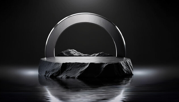 illustration for 3d background stone podium display with water dark gray and silver pedestal with round rim frame abstract minimal black nature scene rock for product presentation or text branding