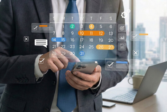 Time management and digital workflow concept. Businessman using smartphone calendar app to manage task, plan schedules, set reminder and track productivity with AI automation helping monitor progress