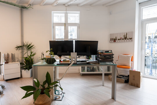 Coworking office desk with two monitors and plants promoting wellbeing