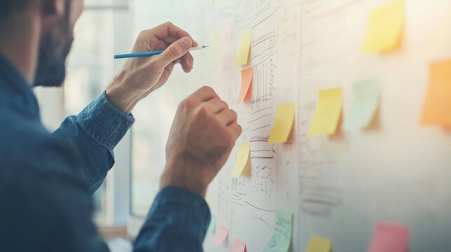 Business professionals brainstorming budget strategies on a whiteboard, colorful post-its and notes