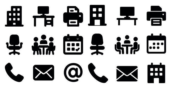 Office tools solid icon set. Essential business and productivity solid icons collection