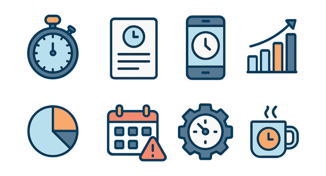 Outline with Fill vector icons of time tracking tools: stopwatch, daily report, mobile tracker app, productivity bar, pie chart, calendar alert, clock gear, break reminder.