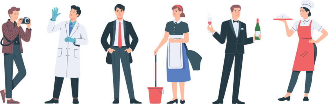 Occupational character illustration, waiter, chef, cleaner, scientist, photographer, businessman, profession bundle, uniform people, vector art