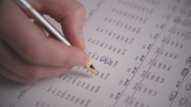 Caucasian Tax Preparer Circling Totals On Printed Tax Return With Precise Pen Strokes, Closeup Of Hand Highlighting Deductions And Figures, Tense Yet Professional Tax Season Atmosphere