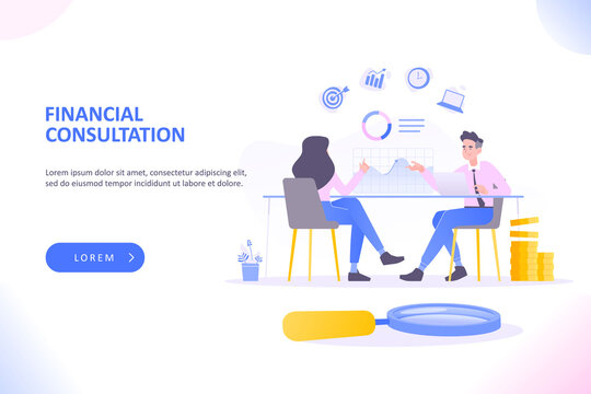 Financial advisor service concept. Giving financial consultation to customers. Business analysis. Professional help. Isolated modern vector illustration