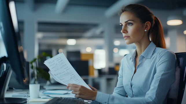 A businesswoman looking at an invoice on her computer in a modern office. Professional setting with financial documents and tech gadgets