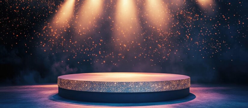 Glimmering round podium with soft lighting and sparkling backdrop ideal for showcasing products or announcements with empty space for text