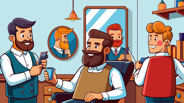 hipster man with stylish beard and hair sits in barbershop, showcasing confident expression. background features barber at work, creating vibrant atmosphere