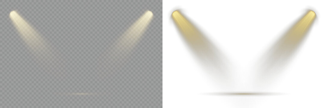 Vector Spotlights. Scene. Overlay effects simulate professional studio illumination. Stage lighting creates dramatic beams in concert visuals. Concert lighting set includes soft beams. Light Effects.