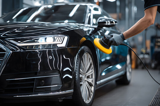 Car detailing and polishing concept of professional man car service worker with orbital polisher polishing black luxury car in auto repair shop