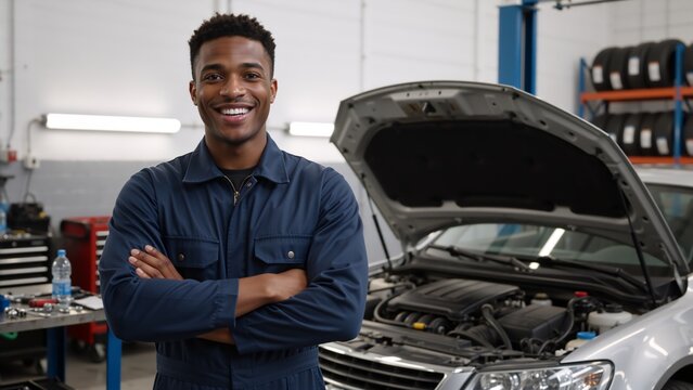 Confident Black car mechanic smiling in an auto repair shop. Professional male technician with arms crossed standing by a car with an open hood