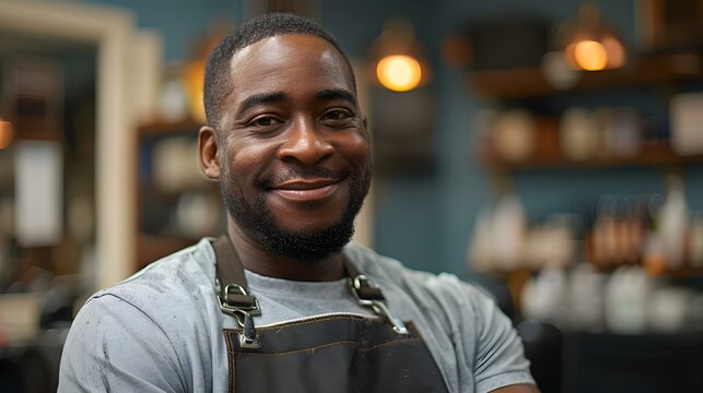 Portrait of handsome young african american barber posing with his arms crossed inside a barbershop.