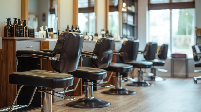 A row of professional barber chairs in front of wooden counters with various hair care products