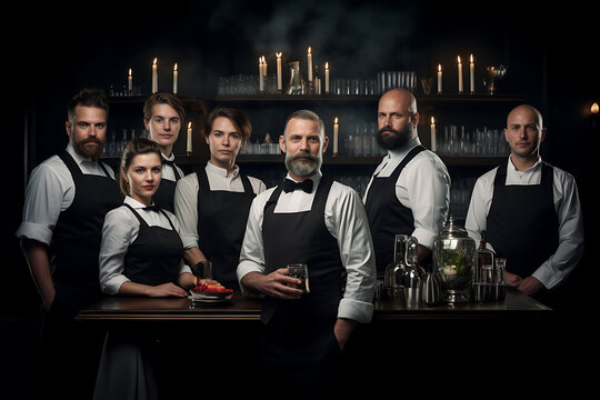 A team of professional bartenders and mixers on a dark backdrop, ready to work at the bar counter in a well-lit studio. Generative AI.