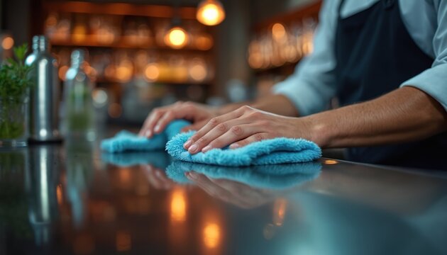 Bartender cleans shiny bar counter with soft blue cloth. Man in apron prepares workspace at pub. He wipes surface, ensuring hygiene and cleanliness for guests and drinks.