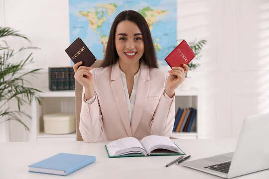 Portrait of skilled administrative assistant of office satisfied with occupation using laptop computer at job, professional female receptionist looking at camera organizing booking on netbook