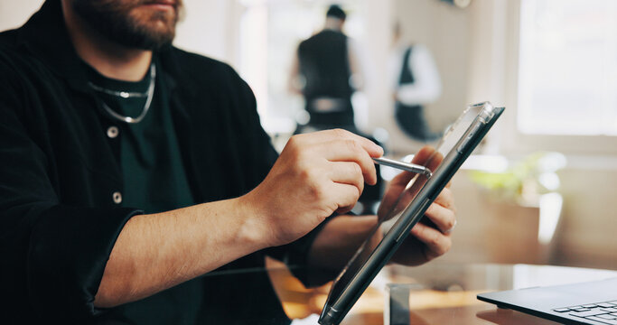 Hairdresser, salon and hands of man on tablet for online inventory, client appointment and schedule. Hair stylist, stylus and person on tech for planning, calendar and website for booking service