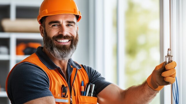 construction worker wearing an orange hard hat and gloves stands in a brightly lit workshop, smiling confidently while holding a set of tools