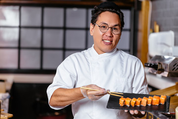 attractive master chef offers to taste new kind of sushi. kindness, advertisement of sushi. close up photo
