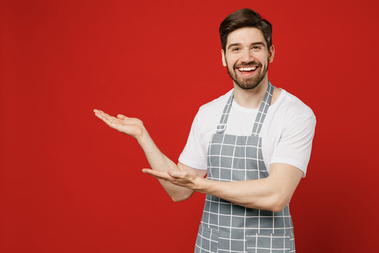 Young male housewife housekeeper chef cook baker man wear grey apron point hands arms aside indicate on workspace area copy space mock up isolated on plain red color background. Cooking food concept.
