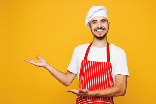 Young smiling housewife housekeeper chef cook baker man wear red apron toque hat point hands arms aside on area mock up isolated on plain yellow orange background studio portrait Cooking food concept
