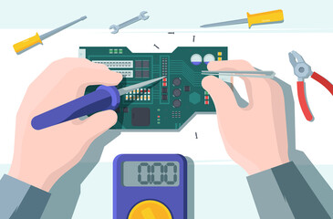 Computer board repair illustration. Soldering processor connections warranty repair maintenance in service center professional engineering restoration damaged PC elements. Vector flat technology.