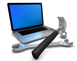 Business man in glasses spectacles, black suit showing laptop with empty mockup screen, on violet purple background, with copy space. It expert,  technician repair service, tech support, maintenance.