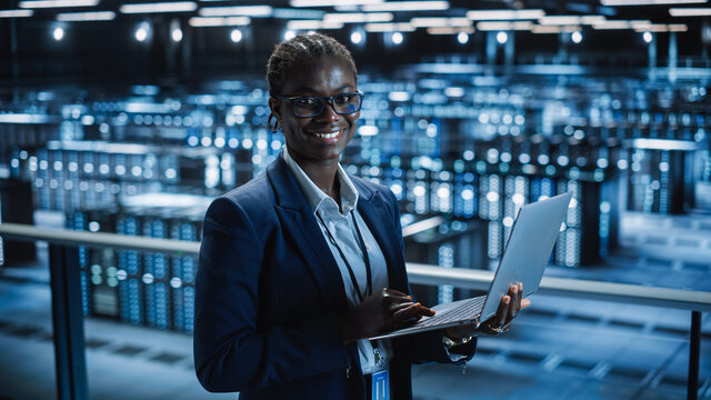 Data Center Female Programmer Using Laptop Computer, Maintenance IT Specialist. In Cloud Computing Server Farm Smiling System Administrator Working on Cyber Security for Iaas, saas, paas.