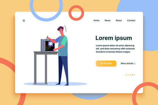 Professional technicians repairing computer in office. Men in uniform with repair tools flat vector illustration. Technology, computer service concept for banner, website design or landing web page