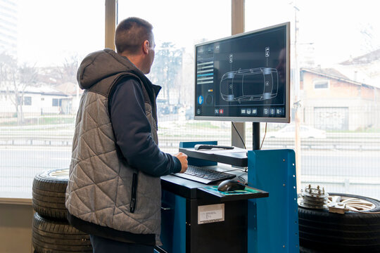 Young repairman  technician mechanic uses pc computer with car diagnostic software. Mechanic man checking car in workshop at auto car repair service center. Automotive Electronic Diagnostic.