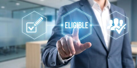 Businessman Pressing Virtual Screen with Eligible Inscription: Business Qualification, Financial Criteria and Loan Eligibility Concept