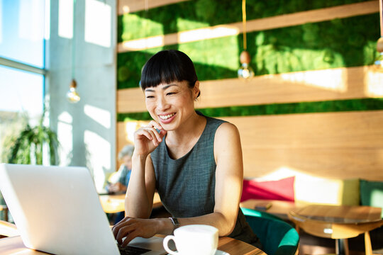 Smiling young Asian businesswoman working with laptop in modern cafe