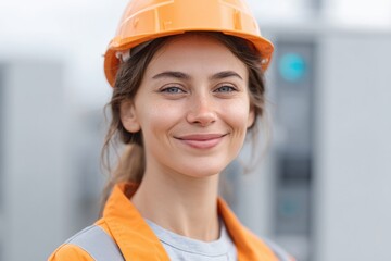 Smiling woman in safety gear exuding confidence at construction