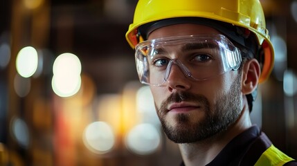 A determined construction worker wearing safety gear gazes forward, embodying focus and dedication amidst a sunlit construction site as beams line the background.