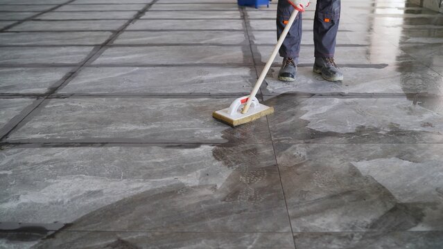 Professional construction worker meticulously cleaning marble tile floor using sponge and bucket, maintaining hygienic workspace during renovation project