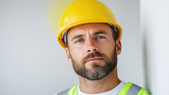 A construction worker, wearing a yellow hard hat and safety vest, is shown in a close-up. The image is well-lit and high-resolution, showcasing a serious expression. The style is professional and st