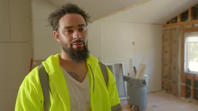 A construction worker in essential safety gear, including a helmet and reflective jacket, is actively engaged in a renovation project, demonstrating his dedication and professionalism