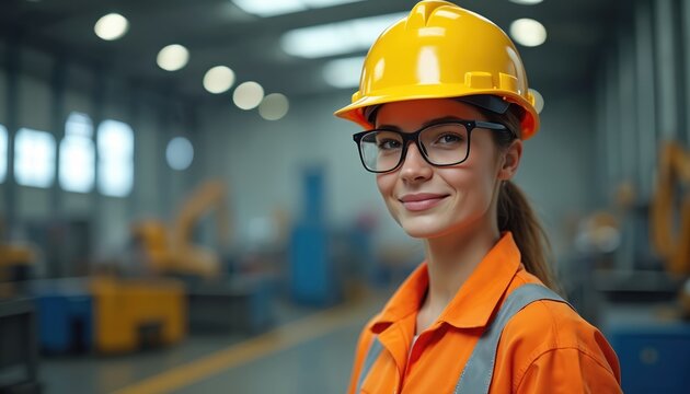 Female engineer in hard hat, safety glasses smiles in factory. She wears orange work clothes. Background shows industrial machinery, warehouse setting. Represents modern industry, skilled labor.