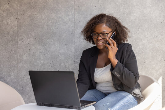 Black woman, phone call and typing on laptop in office, schedule meeting and talking to client. Female person, communication and online for news quote by contact, press journalist and calendar notes