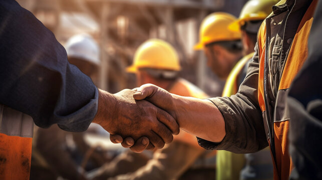 A handshake between a contractor and a homeowner after signing a renovation contract, with blueprints, tools, and a construction site visible through the office window.