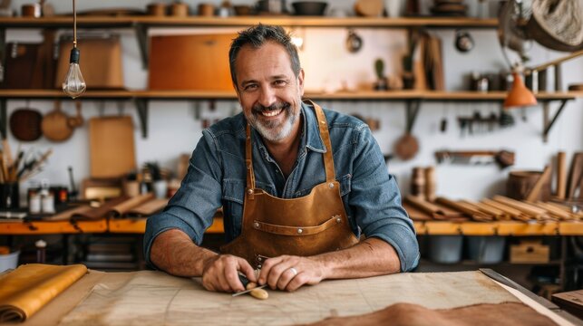 Cheerful artisan with a beard working with leather in a well-organized workshop