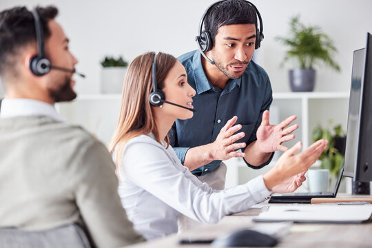 Customer service by young professional asian male and female agents with headsets and computer working at office. Concept of professional operator, call center and customer support. Selected focus.