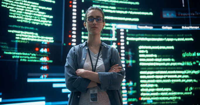 A confident woman with stylish glasses poses in a high-tech data center, illuminated by blue lights