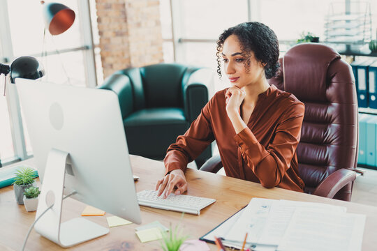 A confident businesswoman, her eyes sparkling with success, gazes directly at the camera while engrossed in a touchpad, a modern symbol of her professional prowess and dedication in a contemporary