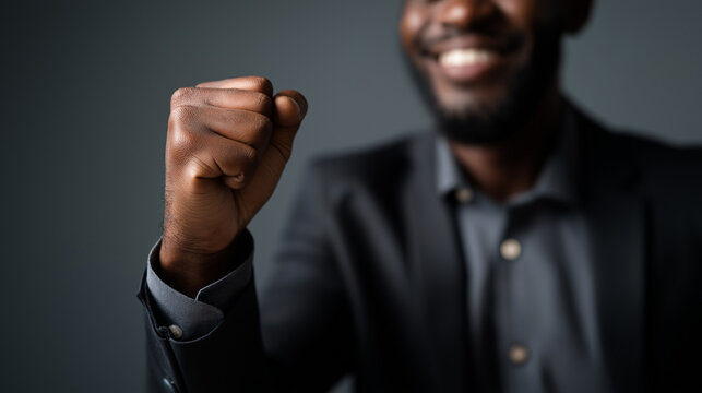 Accomplished professional showing triumph gesture faceless overjoyed businessman defocused grey background celebratory expression display victory signal scene business achieve