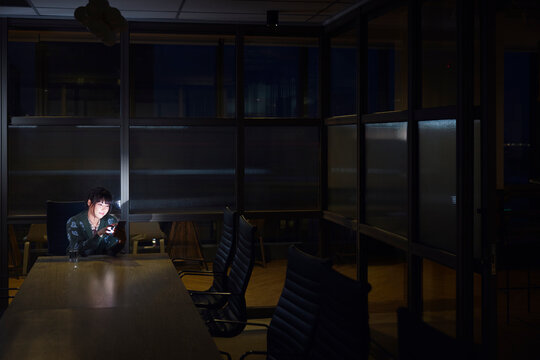 Distant view of female business professional using smart phone while working late in dark office board room