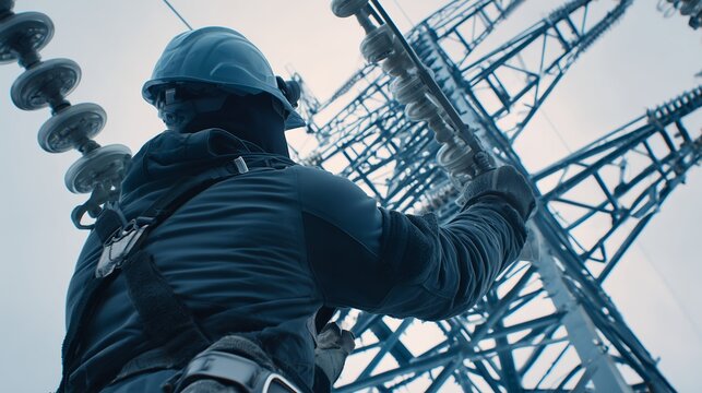 Lineman in safety gear inspecting high voltage insulators on a massive electrical transmission tower, concept for infrastructure management, energy advertising and industrial maintenance projects