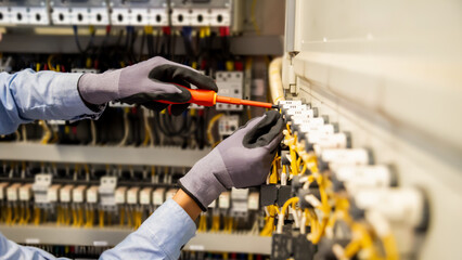 Electricians work to connect electric wires in the system, switchboard, electrical system in Control cabinet.