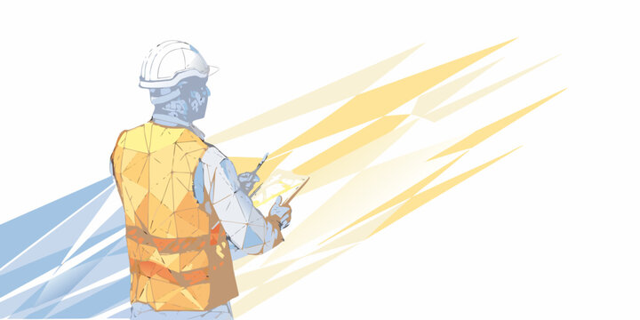 Construction Worker in Digital Art: Abstract polygonal portrait of a construction worker wearing a hard hat, symbolizing strength, resilience, and innovation in the building industry.