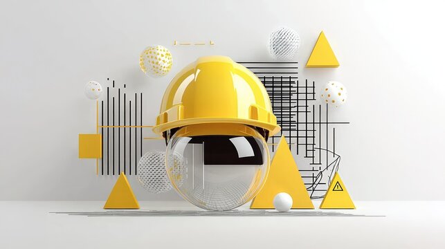 Young adult construction worker wearing hard hat and safety vest looking forward with geometric shapes Concept of engineering, architecture, and building industry